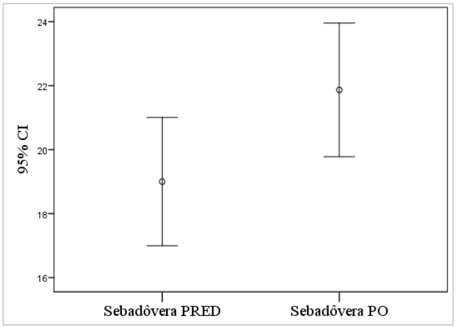 Graf 13 Error Bar znázorňujúci premenné Sebadôvera PRED a Sebadôvera PO