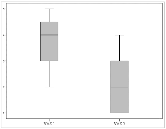 Graf 14 Boxplot znázorňujúci premenné VAS 1 a VAS 2