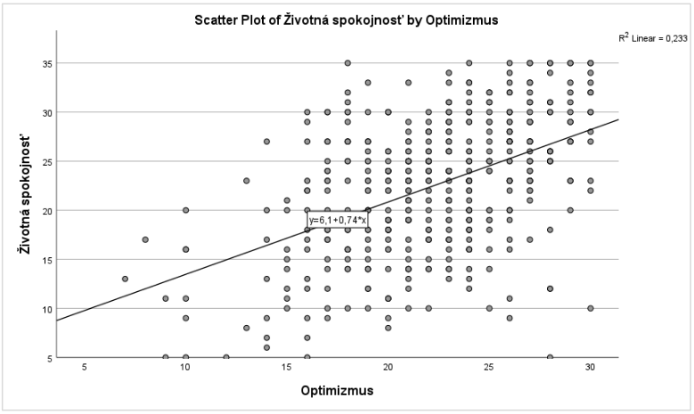 optimizmus významne predikuje životnú spokojnosť. Získaný regresný model je: Životná spokojnosť = 6,096 + 0,737xOptimizmus. Regresná analýza bola štatisticky významná (R 2 = 0,233, F(1;433) = 131,832; p = 0,001). Zistili sme, že optimizmus významne predikuje životnú spokojnosť (Beta = 0,483; p = 0,001), z toho dôvodu hypotézu prijímame.