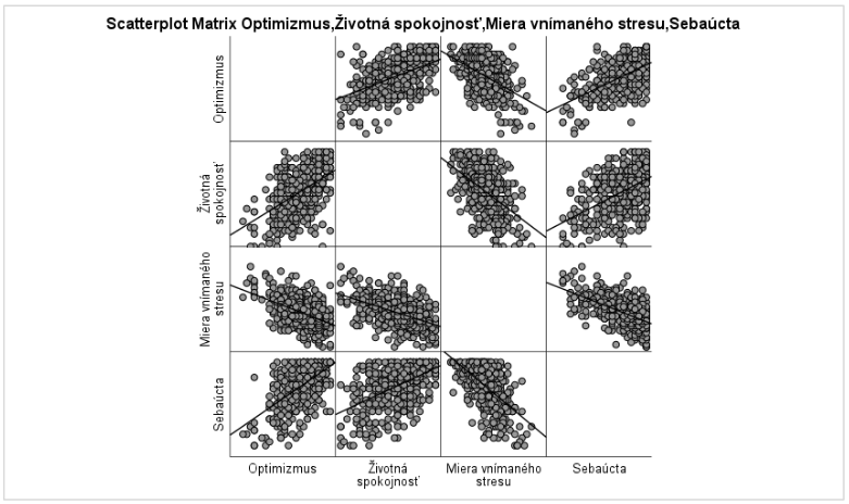 Graf 17 Bodový maticový graf zobrazujúci lineárny vzťah medzi prediktormi (optimizmus, miera prežívaného stresu, sebahodnota) a závislou premennou životná spokojnosť