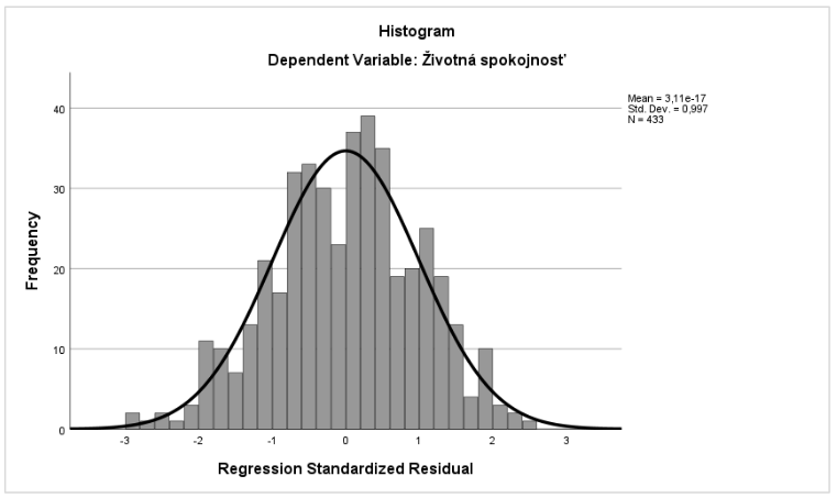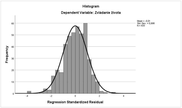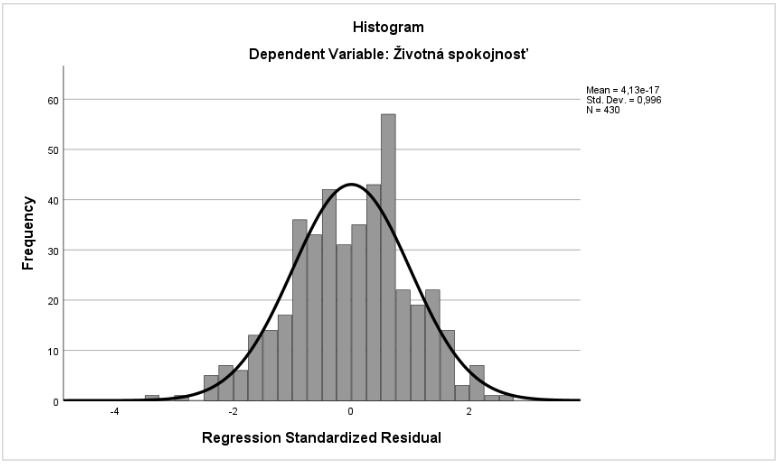 Kontrola predpokladov: Pred preskúmaním predikčnej sily regresného modelu sme posúdili všetky dôležité predpoklady, s cieľom potvrdiť adekvátnosť analýzy. Prostredníctvom bodových grafov sme overili linearitu prediktorov so závislou premennou a nezistili sme narušenie danej podmienky. Durbin -Watson koeficient dosiahol hodnotu 1,951, na základe čoho konštatujeme, že sa naplnila podmienka nezávislosti rezíduí. Faktor inflácie variancie (VIF) sa pri všetkých prediktoroch nachádzal pod prahom 5 (najvyššia hodnota dosahovala 1,496 pr e premennú sebaúcta), na základe čoho vyhodnocujeme, že všetky z významných prediktorov pridávajú unikátnu varianciu pri predikcii závislej premennej. Kontrola histogramu rezíduí a diagnostika prípadov naznačila, že sa v dátach nachádzajú vplyvné prípady, z toho dôvodu sme vykonali kontrolu vplyvu prípadov a nakoľko hodnoty DF Beta boli v prípade každého prediktoru menšie ako 0,096 (2/√N), usudzujeme, že prípady neovplyvnili stabilitu analýzy. Kontrolou bodového grafu štandardizovaných predikovaných hodnôt a rezíduí bola potvrdená homoskedasticita. Súhrnne tieto diagnostické testy potvrdili predpoklady, na ktorých je založený aktuálne testovaný viacnásobný lineárny regresný model, a poskytli tak solídny základ pre následnú analýzu.