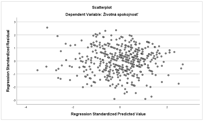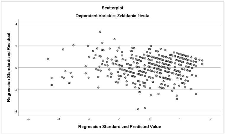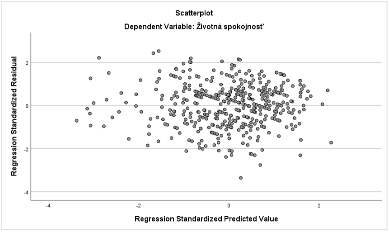 Následne skontrolujeme predpoklad homoskedasticity prostredníctvom bodového grafu zobrazujúceho vzťah štandardizovaných rezíduí a štandardizovanej predikovanej hodnoty závislej premennej. Daný graf testuje či je roz ptyl chýb merania konštantný v regresnom modeli. Ak je rozptyl homoskedastický, model bol dobre definovaný (tip: ak by preukázal opak zvyčajne pomôže pridanie ďalšieho prediktoru).
