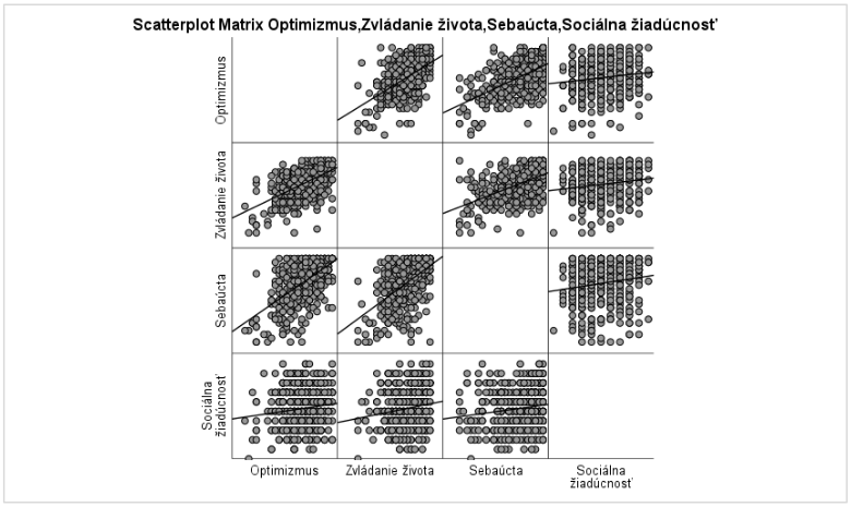 Graf 23 Bodový maticový graf zobrazujúci lineárny vzťah medzi prediktormi (optimizmus, sebaúcta, sociálna žiadúcnosť) a závislou premennou zvládania života